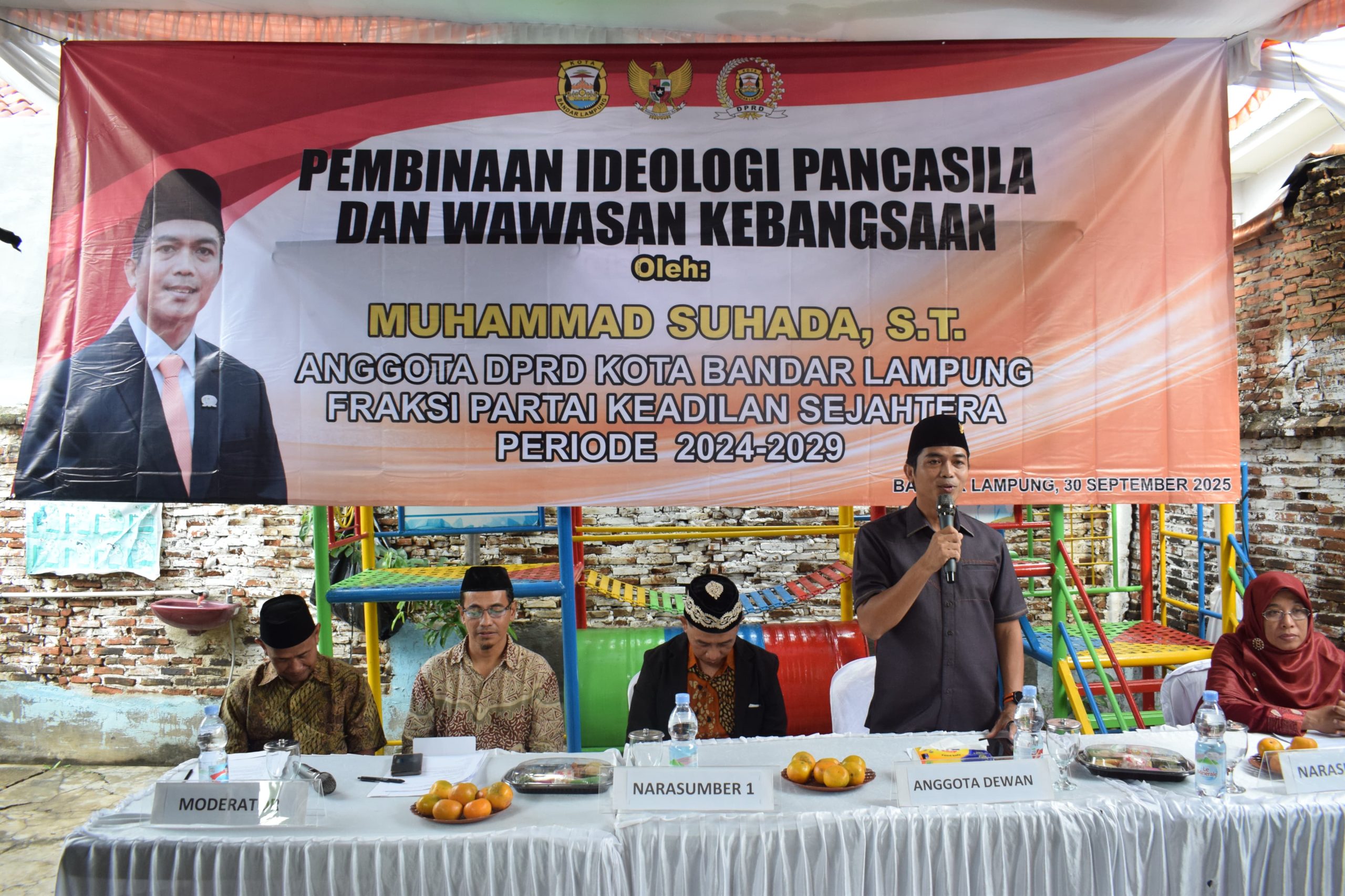 Bandarlampung – Anggota DPRD Bandarlampung, Muhammad Suhada melaksanakan kegiatan pembinaan ideologi pancasila dan wawasan kebangsaan di wilayah Jalan Sadewo Bawah Kelurahan Sawah Lama, Tanjungkarang Timur, Selasa (30/9/2025).