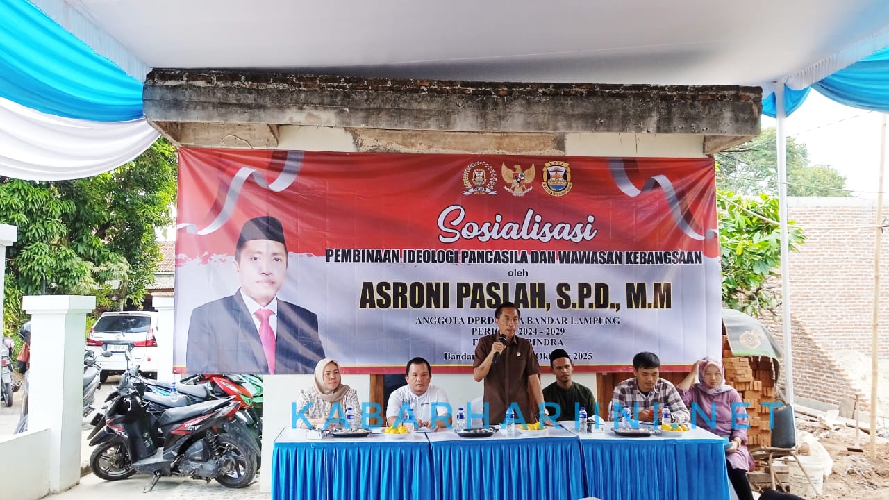 Bandarlampung – Anggota DPRD Bandarlampung Asroni Paslah mengadakan kegiatan pembinaan ideologi pancasila dan wawasan kebangsaan di wilayah Sumberrejo Sejahtera, Kemiling, Sabtu (11/10/2025).