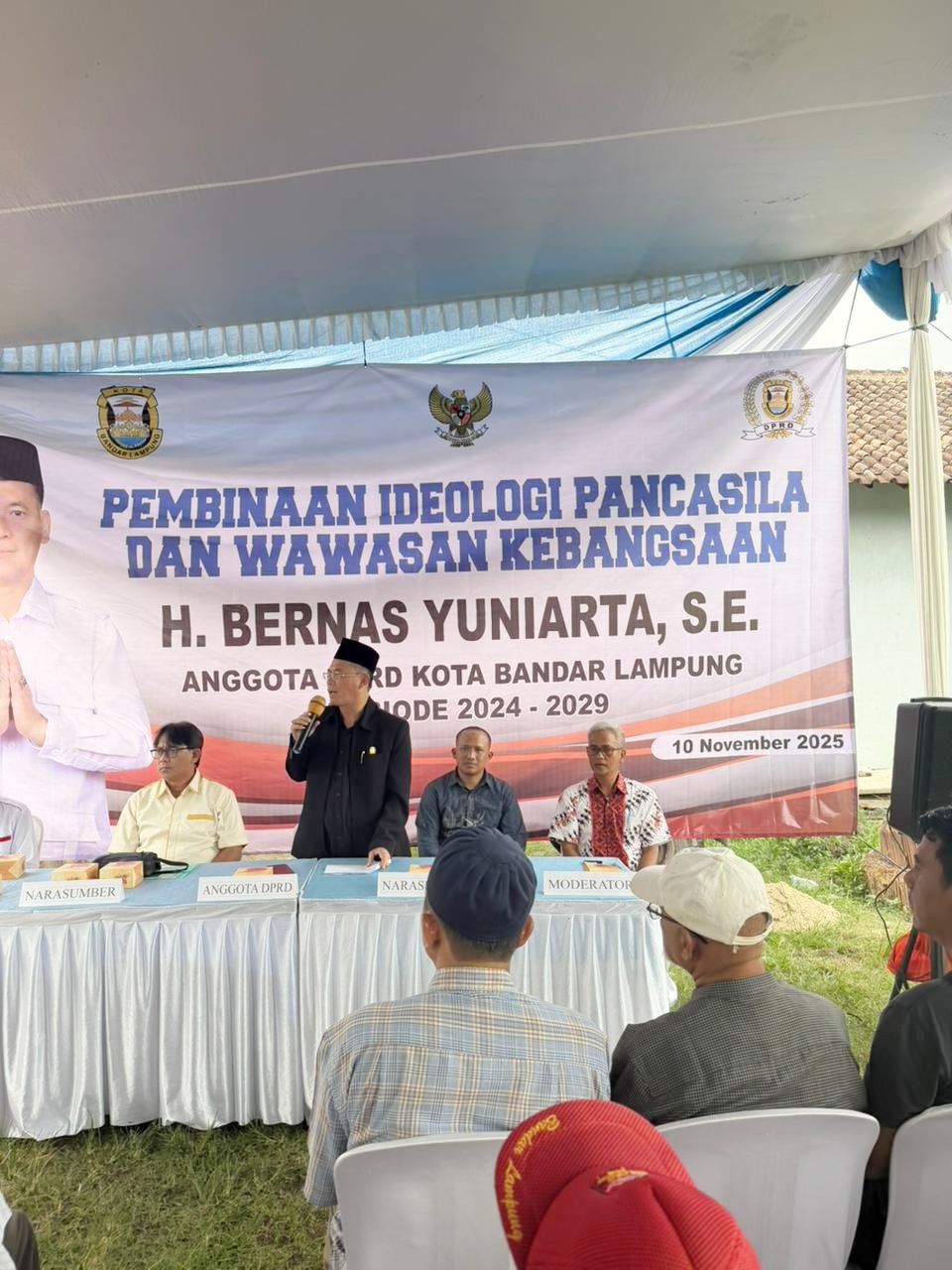 Bandarlampung – Ketua DPRD Bandarlampung Bernas Yuniarta mengadakan kegiatan pembinaan ideologi pancasila dan wawasan kebangsaan di wilayah Jalan P. Morotai, Kelurahan Jagabaya 3, Senin (10/11/2025).