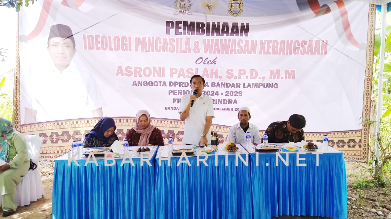 Bandarlampung – Anggota DPRD Bandarlampung Asroni Paslah mengadakan kegiatan pembinaan ideologi pancasila dan wawasan kebangsaan di wilayah Kedaung, Kecamatan Kemiling, Selasa (25/11/2025).