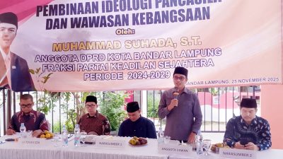 Bandarlampung – Anggota DPRD Bandarlampung Sulistiani mengadakan kegiatan pembinaan ideologi pancasila dan wawasan kebangsaan di wilayah Jalan Sejahtera, Gang Bambu, Sumberejo, Kemiling, Selasa (25/11/2025).