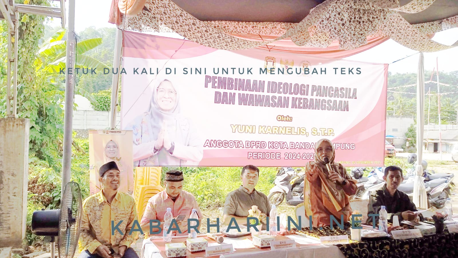 Bandarlampung – Anggota DPRD Bandarlampung Yuni Karnelis mengadakan kegiatan pembinaan ideologi pancasila dan wawasan kebangsaan di wilayah Bakung, Kecamatan Bumi Waras, Selasa (2/12/2025).