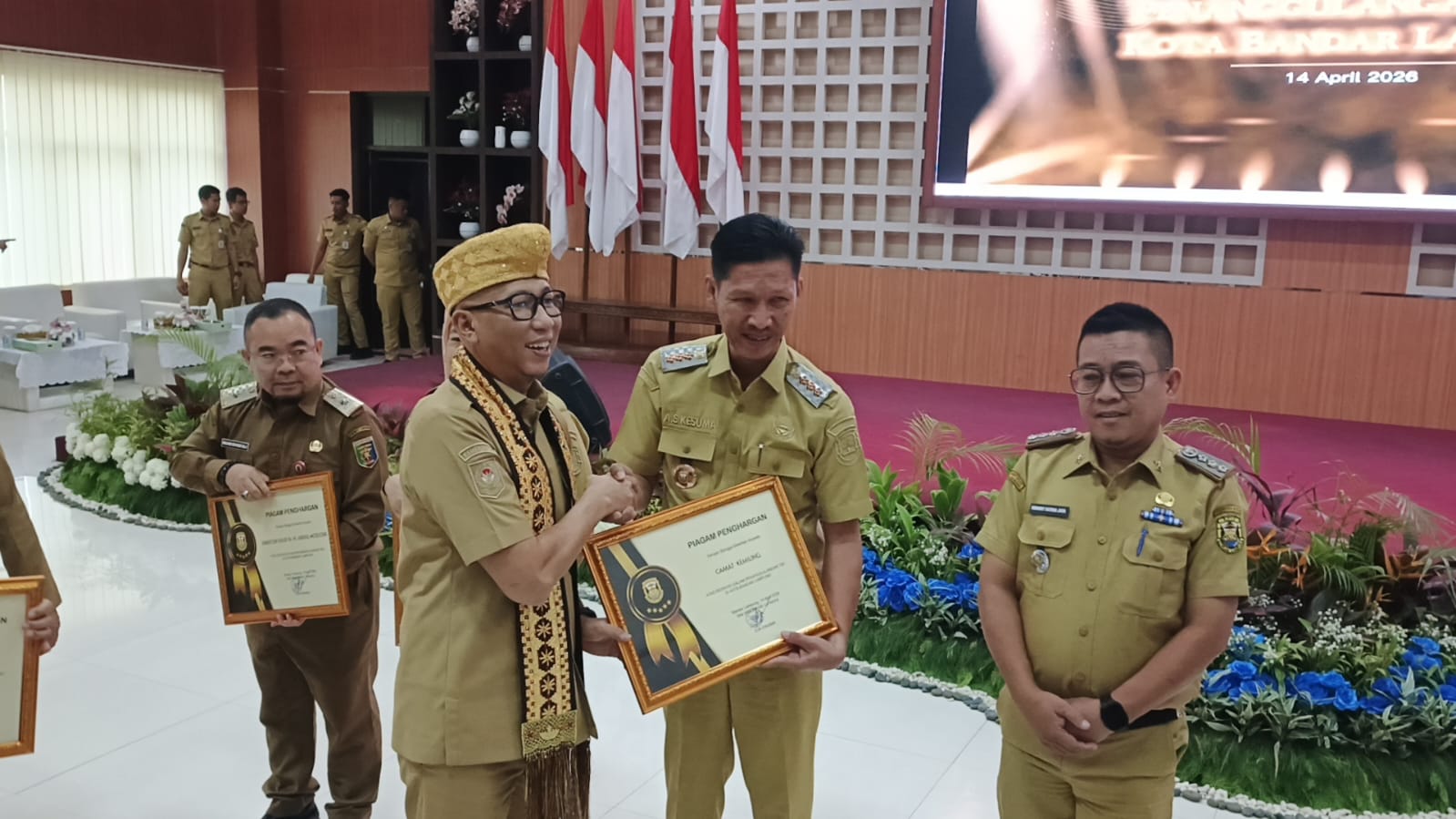 Penghargaan dari Walikota Bandarlampung Eva Dwiana tersebut diserahkan oleh Gubernur Lampung Rakhmat Mirzani Djausal, disaksikan wamendagri, wamenkes dan Walikota Bandarlampung Eva Dwiana, yang dilaksanakan di Gedung Semergou, Bandarlampung, Selasa (14/4/2026).